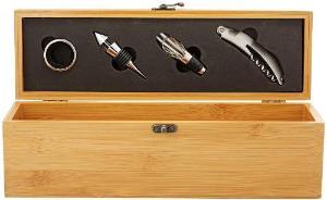 Bamboo Wine Gift Box includes number of tools such as a bottle opener and pourer....